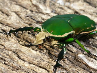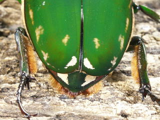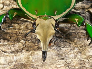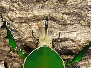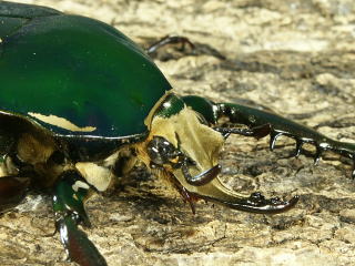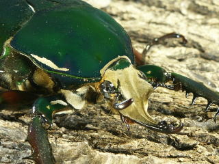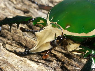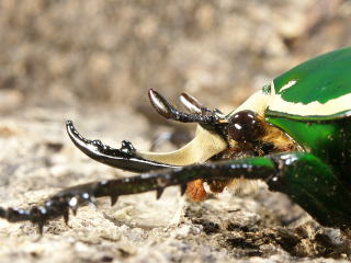 頭部の角に2列の突起があるのがおわかりだろうか。突起は先端部を除き、対になって出ている。拡大してみるとユーモラスな顔に見える。♂の前足はトゲが良く発達していて、同種の♂や他の種との争いには、頭部の角と前足を使って争う。頭部の角と前足の力はかなり強く、手で押さえつけるとかなり痛い。前足の形は、どこかの国の武器にありそうな形をしている。![]() |